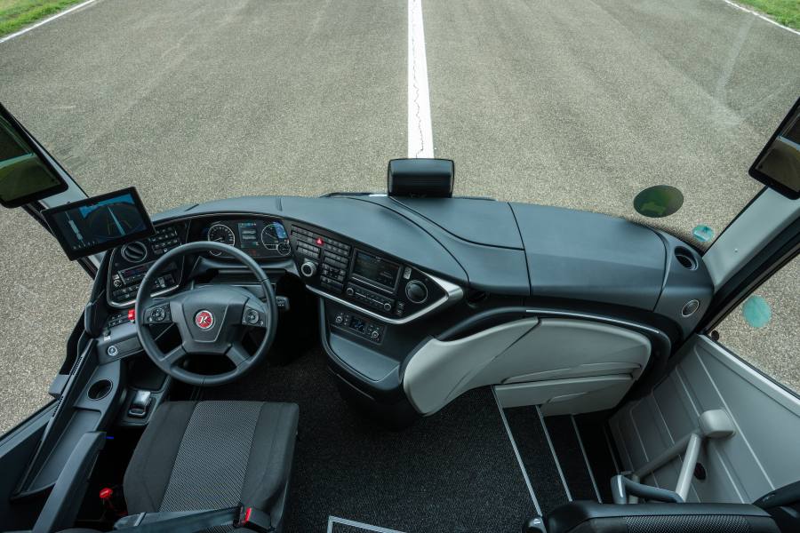Otobüsün sürücü koltuğuna oturduğunuzda sofistike ve kapsamlı bilgi sunan gösterge paneli, ulaşması kolay yüksek kaliteli fonksiyon tuşları ve konforlu sürücü koltuğu Setra Topclass S 516 kokpitinin görünen kısımdaki unsurları. Ancak otobüsü çalıştırdığınız andan itibaren size sürücüye yardımcı olan sistemlerin zahmetsizce devreye girmesi test otobüsümüzü belki de dünyanın en otonom seyahat otobüslerinden biri yapıyor.