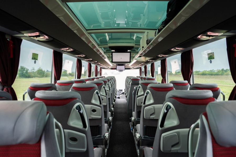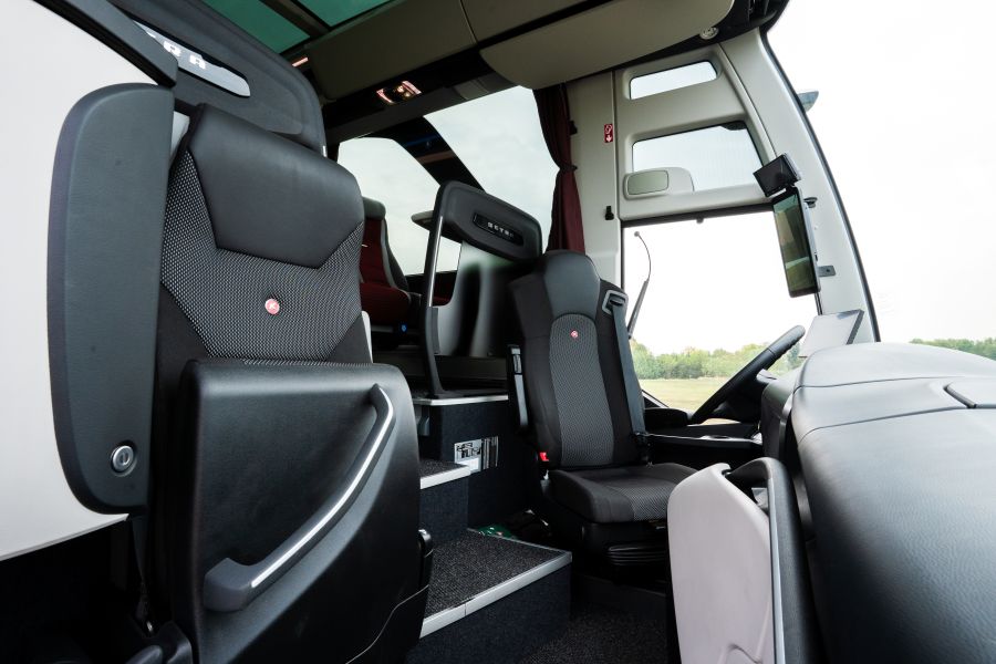 Peki otobüste yolcu alanı nasıl? Koridora geçtiğiniz an ferah ve hatta lüks algısı dikkat çekiyor. Setra süper yüksek katlı otobüs, Harmonia Rosewood ahşap dekorlu zemin kaplaması, şık ve uzun yıllar kullanıma uygun dayanıklı Gecko Amarena kumaştan oturma ve sırtlık yüzeylerine sahip 48 Setra Voyage Ambassador koltuklara sahip. Ayarlanabilir baş dayanakları, demir grisi yan destekleri ve sırtlıkları ve açık kahverengi perdeler yolcu bölümünde dikkat çekiyor.