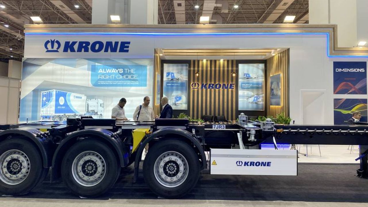 İzmir’de dördüncüsü düzenlenen Logistech fuarına katılan KRONE standında 20', 30', 40' ve 45' konteyner taşıma yeteneğine sahip, yeni nesil konteyner taşıyıcı ELTU70-2 ile deniz yolu lojistiğine yönelik çözümler tanıtıldı. Konteyner taşıyıcının yanı sıra sektörün frigorifik çözümler, perdeli ve plato treylerlerden farklı lojistik ihtiyaçlara yönelik özel çözümler hakkında bilgilendirmeler yapıldı.
